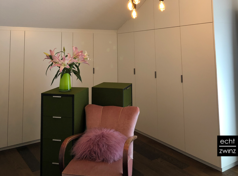 Ein herrschaftliches Schlafzimmer durften wir mit diesen Kunden gemeinsam entwickeln. Der verwinkelte Grundriss der ganzen Wohnung hat immer wieder nach cleveren Lösungen verlangt, die Herr Zwinz mit den Kunden entwickeln durfte. Im Schlafzimmer unterm Dach finden Eleganz und Gemütlichkeit jedoch in besonderem Maße zusammen. Gegenüber dem Yakisugi-Doppelbett mit vollflächig gepolsterter Rückwand blicken die Liegenden auf dieses Panorama einer Ankleide. Unter einem Baldarchin mit neun edlen Edison-Lampen thronen die Herrschaften zur Be- und Entkleidung wahlweise auf Samt sitzend. Zwei knallige Filz-Korpusse bergen daneben kontrastreich die nötigen Accessoires. Da kann man bei der Tour durch die Wohnung das Schlafzimmer nicht geheimhalten.