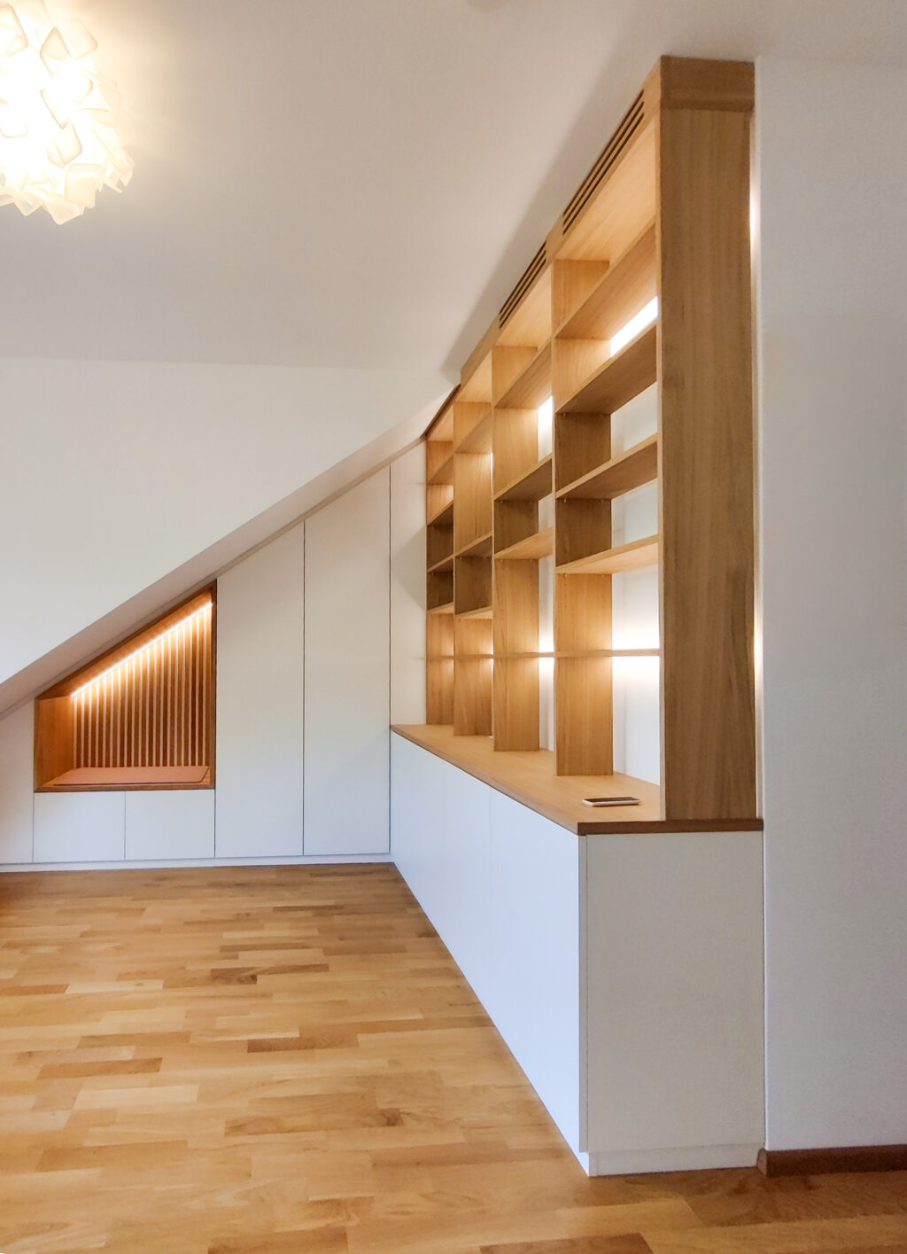 Besonderes Highlight ist die eingelassene Sitznische in der Dachschräge. Vertikale Holzlamellen, warm hinterleuchtet, rahmen die Nische wie eine kleine architektonische Bühne. Die gepolsterte Sitz- und Liegefläche wird zum Lieblingsplatz – zum Lesen, Träumen oder einfach zum Ankommen.