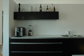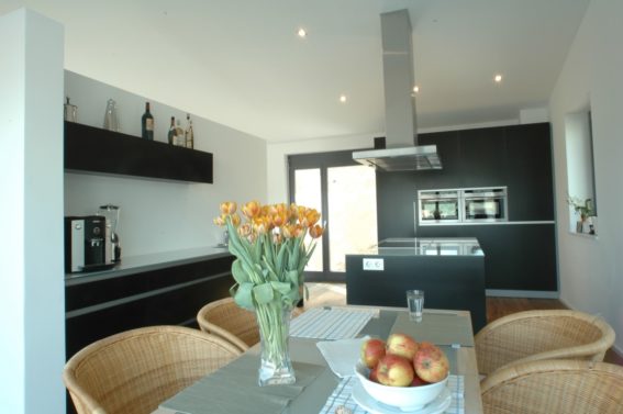 Offene Architektur, hohe Räume, große Fensterfronten – das fanden wir bei diesem Projekt vor. Die schwarze Küche, die es zu planen galt, sollte klar, nüchtern, schlicht und offen sein. Zur Verwirklichung musste eine Zwischenwand entstehen, um der Küche `Raum´ zu geben.
