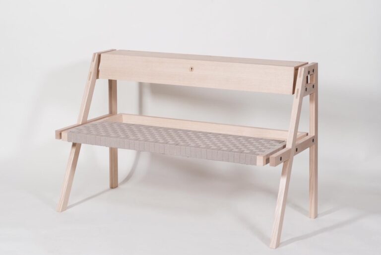 Gesellenstück in Tanne und Nußbaum mit Cohera-Leder von Leonie Scheel; Ausbildungsbetrieb: Schreinerei Zwinz GmbH, Weberstraße 57, 70182 Stuttgart. 2024, Gewerbliche Schule für Holztechnik Stuttgart