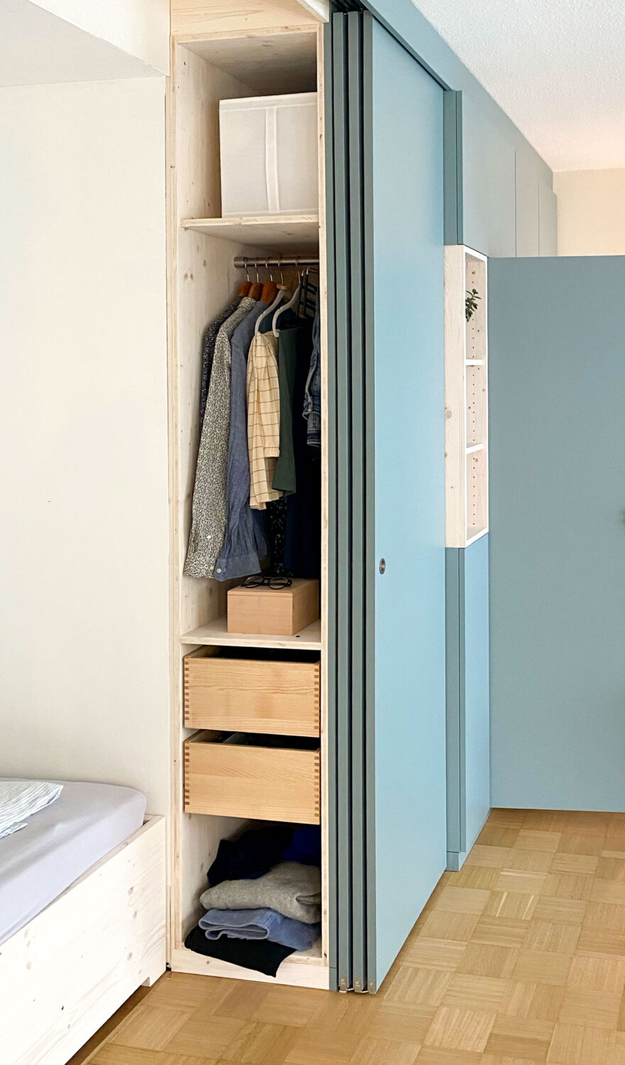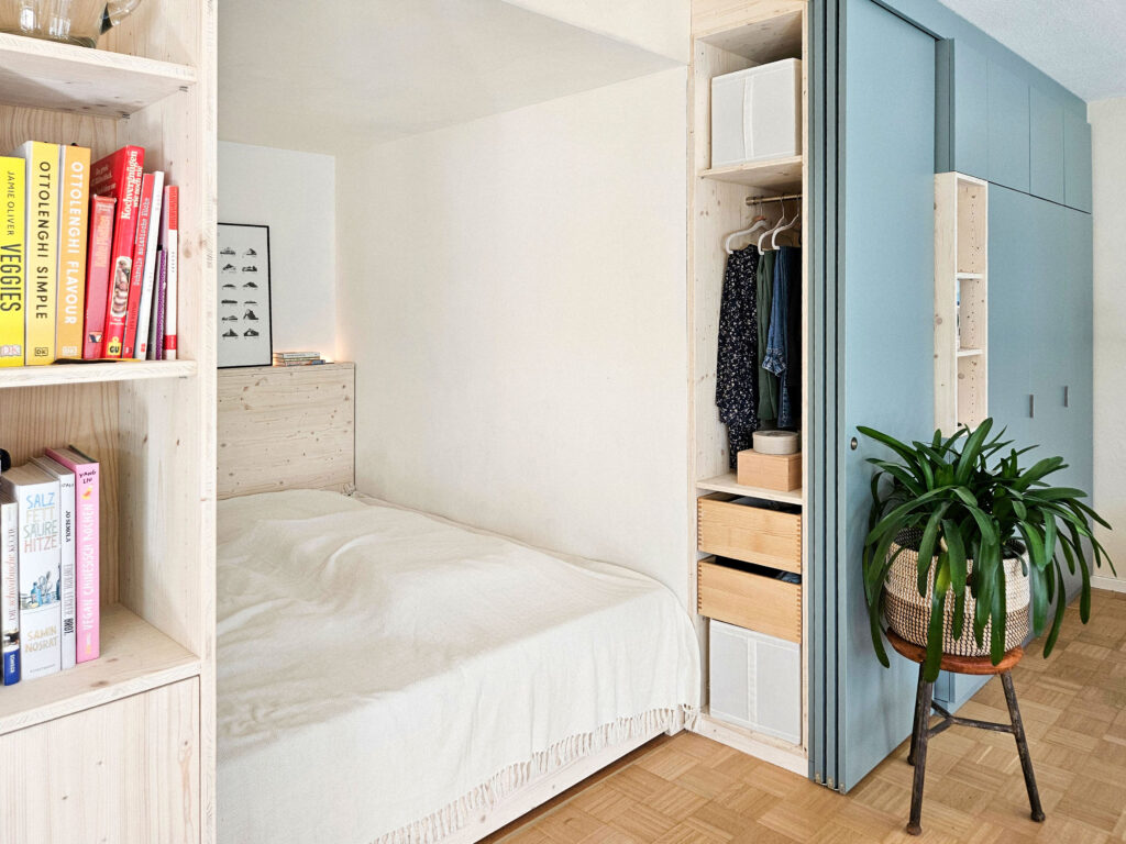 Die zentrale Idee: Aus einem bestehenden Wohnraum wird durch eine Bettnische mit Einbauschrank und Schiebetüren ein zusätzlicher Raum geschaffen. Die Nische funktioniert wie ein eigenes Zimmer im Raum: