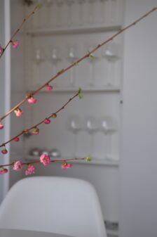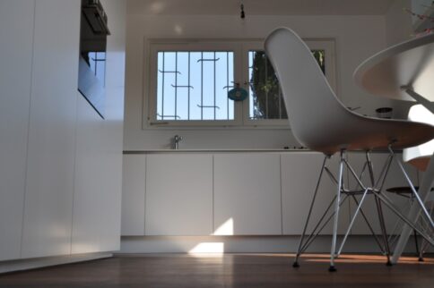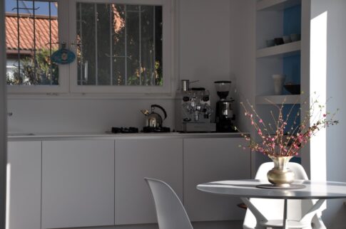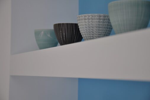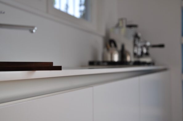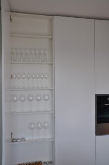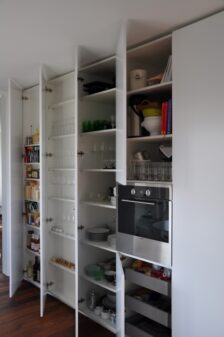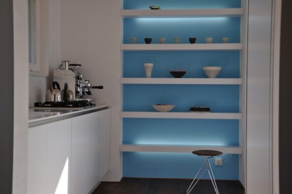 Wenn man die Essküche betritt, begrüßt einen das weiße Regal und zieht alle Blicke auf sich. Die Fachböden werfen Licht auf die blaue Rückwand und lassen die Böden somit optisch schweben. Von Wand zu Wand spannt sich eine Arbeitszeile – grifflos, die Arbeitsplatte aus weißem Mineralwerkstoff, die Fronten weiß lackiert. Die Hochschrankzeile überspielt geschickt einen Mauervorsprung und lässt ihn hinter den Fronten verschwinden. Alles hat seinen Platz und wirkt leicht und luftig. Smart, so eine Essküche. Entwurf: Michael Walker, Freier Architekt.