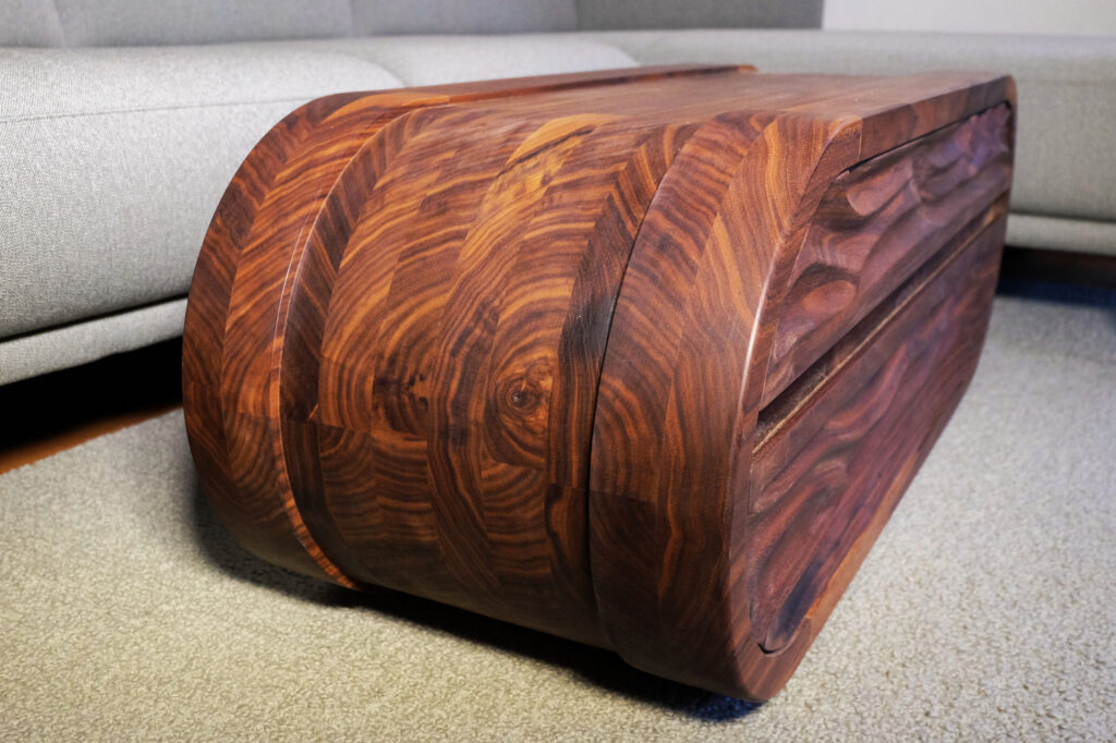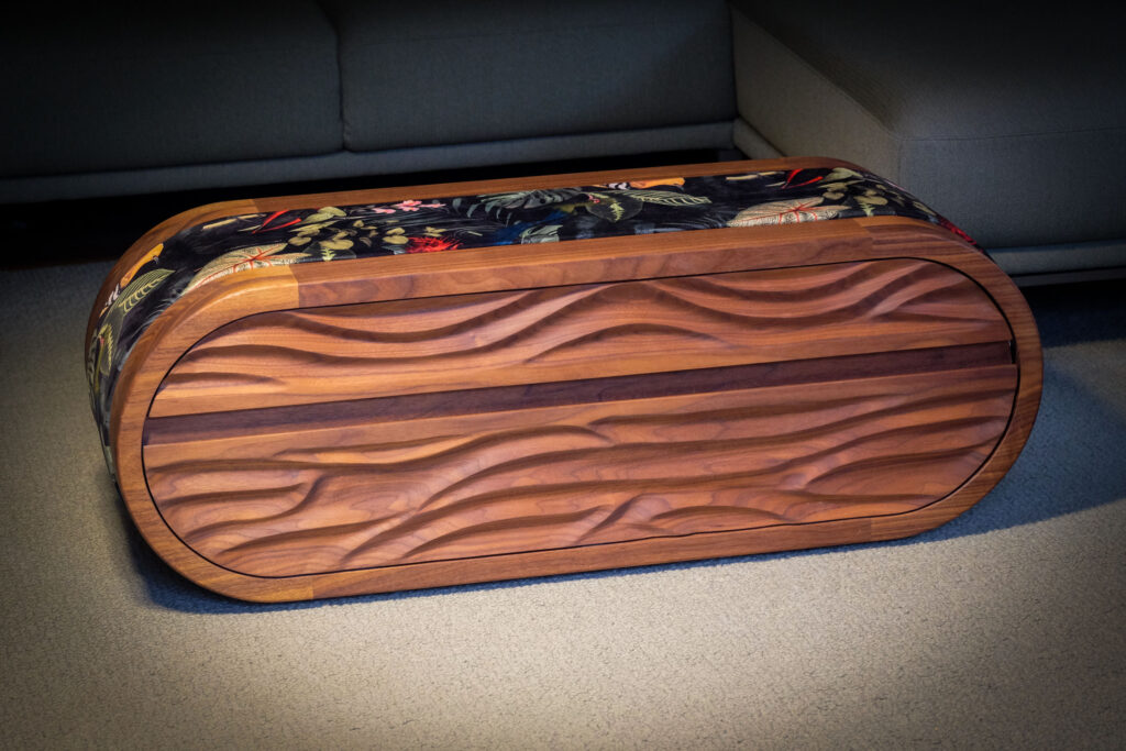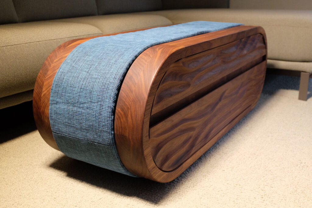 Der Korpus aus massivem Ahorn und amerikanischem Nussbaum verbindet handwerkliche Präzision mit einer eigenständigen, lebendigen Formensprache. Im oberen Teil der zweigeteilten Front befindet sich ein gezinkter Schubkasten auf Vollauszügen, der Platz für Laptop, Magazine oder Alltagsgegenstände bietet. Im unteren Bereich öffnet eine Klappe einen großzügigen Stauraum für Bücher, Spiele und vieles mehr. Gehalten wird sie von Kordeln, geschlossen durch eingelassene Magnete. Auch die Rückseite ist gestaltet und mit einem eingefrästen Wellenmuster versehen, sodass das Möbel frei im Raum stehen kann. So entsteht ein anpassbares Sofamöbel mit Stauraum, Komfort und einer starken gestalterischen Präsenz.
