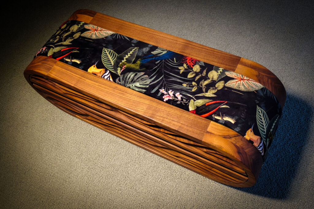 Gesellenstück in amerikanischem Nussbaum, Ahorn und Stoff von David Leuthe; Ausbildungsbetrieb: Schreinerei Zwinz GmbH, Weberstraße 57, 70182 Stuttgart. 2024, Gewerbliche Schule für Holztechnik Stuttgart